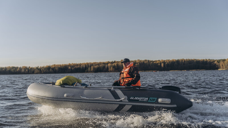 Это единственная модель лодок от Gladiator в этом размере, которая не имеет носового тента в базовой комплектации и это стало неожиданным плюсом применительно к данной ситуации. Ведь я собирался пройти по относительно спокойной акватории, а не пробиваться многие сотни километров сквозь бушующие волны той же Ладоги, как это бывает в основной массе моих водномоторных путешествий и где наличие носового тента является обязательным условием. В результате в кокпите лодки были компактно размещены комплекты снаряжения двух человек, включая сюда палатки, спальники, гермоупаковки и кухонное снаряжение в виде казана с учагом и газовой плиты с баллонами и много чего ещё. И при этом ещё оставалось место для третьего такого же комплекта и пассажира, который смог бы ехать в комфорте. Что касается двигателя, то я уже много ходил на Gladiator 9.9PRO, включая Ладожскую кругосветку протяженностью в 700 километров, которые были пройдены за три дня, чтобы