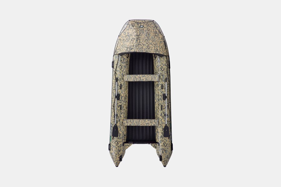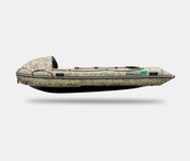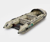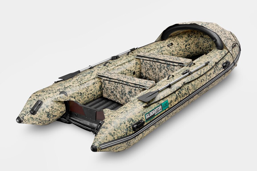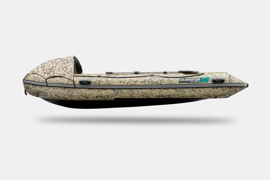Восьмиместная килевая моторная лодка GLADIATOR E450PRO камуфляжного цвета со стационарным транцем под мотор до 40 л.с.