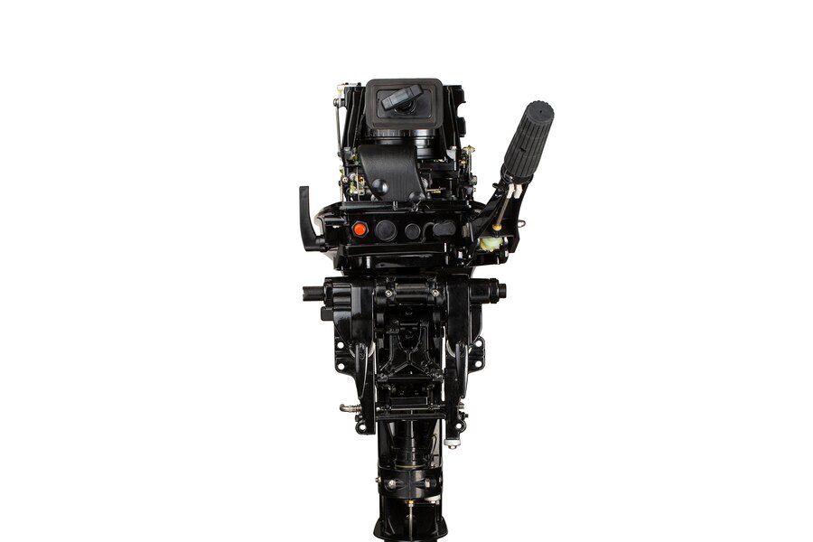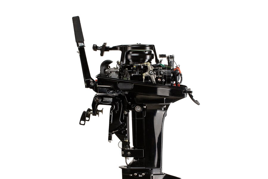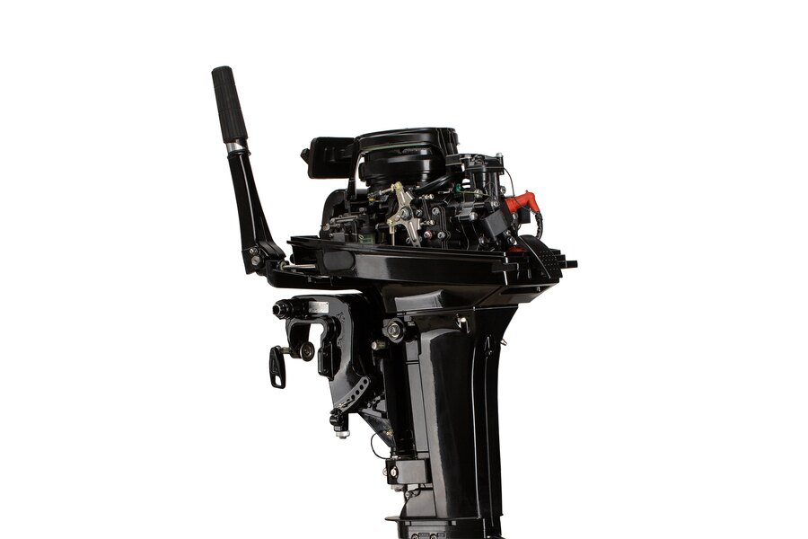 Переключение передач осуществляется рычагом в сбоку. Положений у рычага три — вперед, нейтраль, назад. Кнопка остановки двигателя находится на румпеле, она снабжена предохранительной чекой экстренного выключения.
