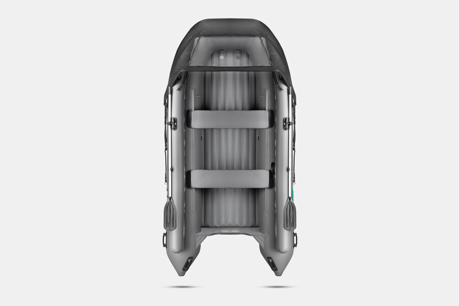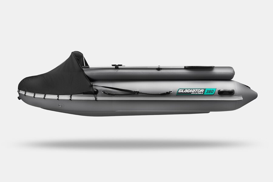 Пятиместная килевая моторная лодка GLADIATOR E380X темно-серого цвета со стационарным транцем под мотор до 30 л.с.