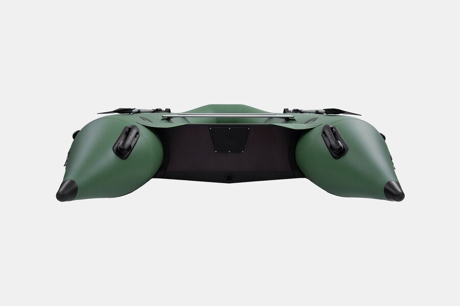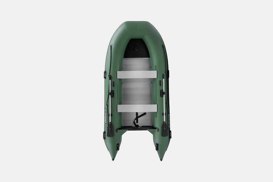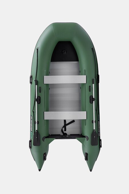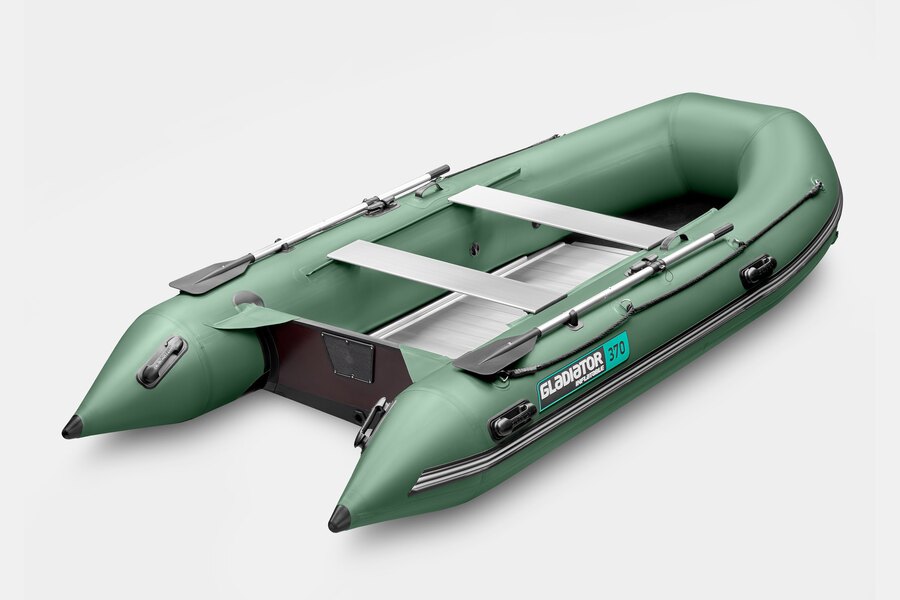 Пятиместная килевая моторная лодка GLADIATOR B370 зеленого цвета со стационарным транцем под мотор до 30 л.с.