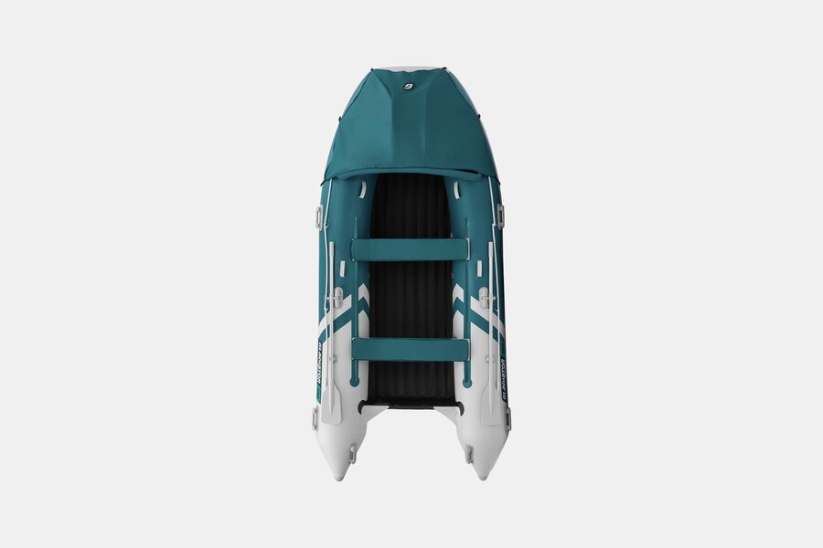 Четырехместная килевая моторная лодка GLADIATOR E380PRO морской зелено-белого цвета со стационарным транцем под мотор до 30 л.с.