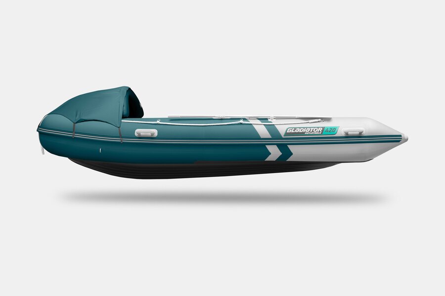 Шестиместная килевая моторная лодка GLADIATOR E420PRO морской зелено-белого цвета со стационарным транцем под мотор до 40 л.с.