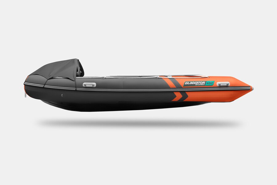 Восьмиместная килевая моторная лодка GLADIATOR E450PRO оранжево-темносерого цвета со стационарным транцем под мотор до 40 л.с.