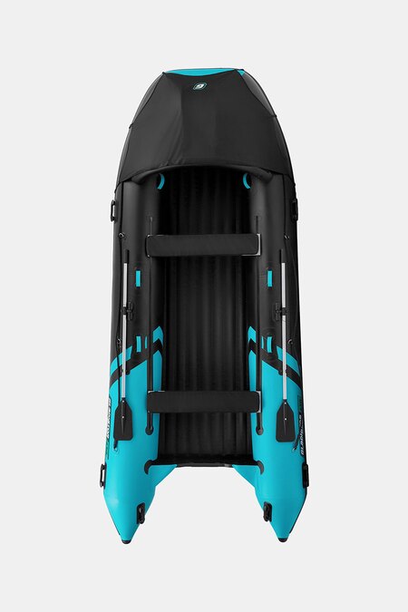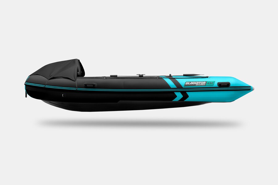 Восьмиместная килевая моторная лодка GLADIATOR E450PRO черно-бирюзового цвета со стационарным транцем под мотор до 40 л.с.