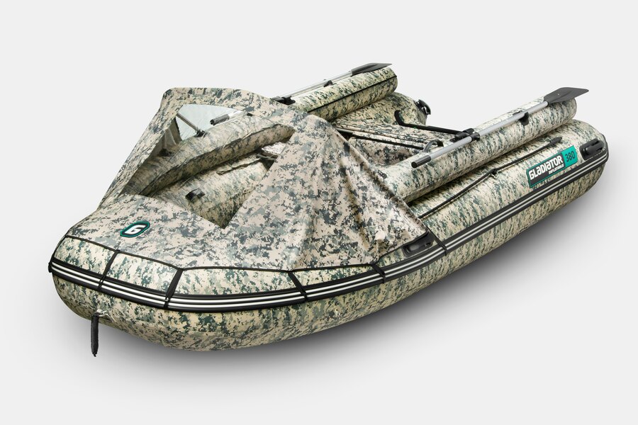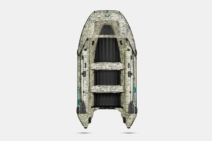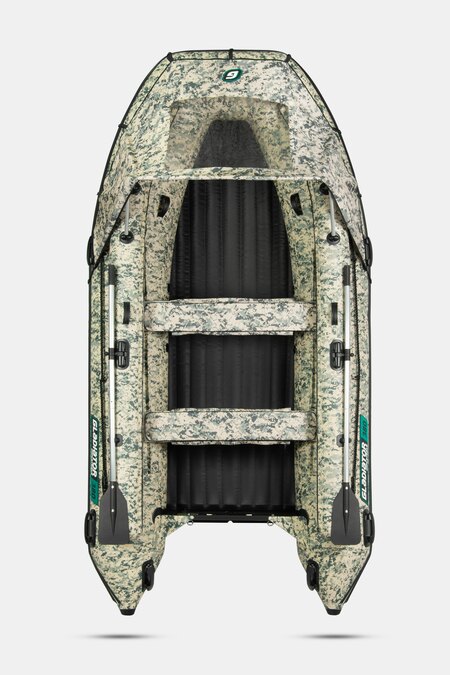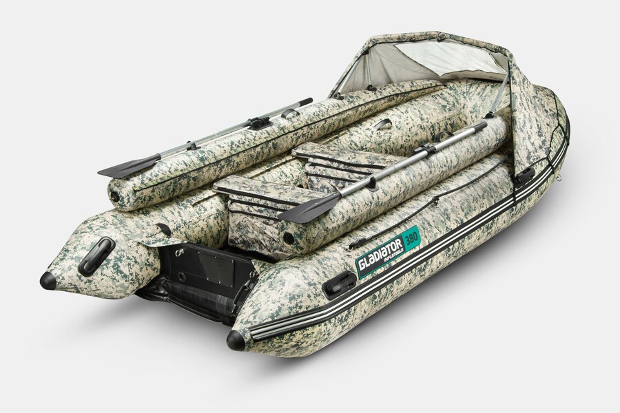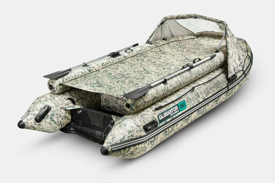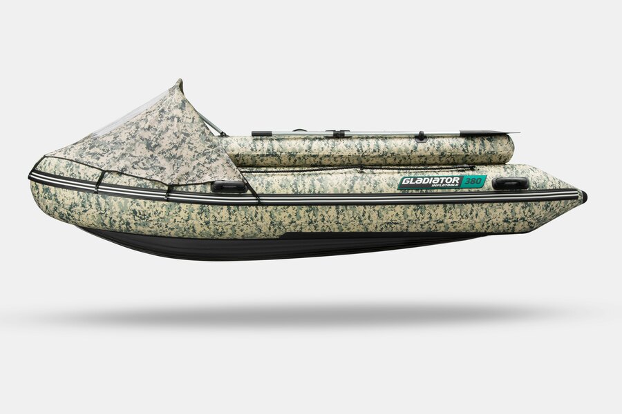 Четырехместная килевая моторная лодка GLADIATOR E380PROX камуфляж со стационарным транцем под мотор до 30 л.с.
