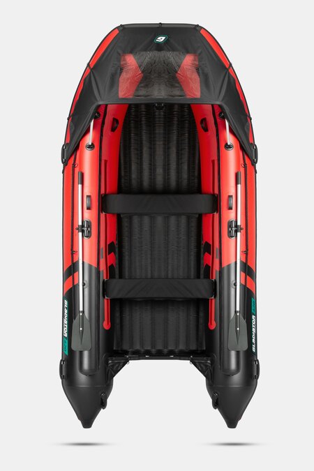 Шестиместная килевая моторная лодка GLADIATOR E420PROX красно-черного цвета со стационарным транцем под мотор до 40 л.с.