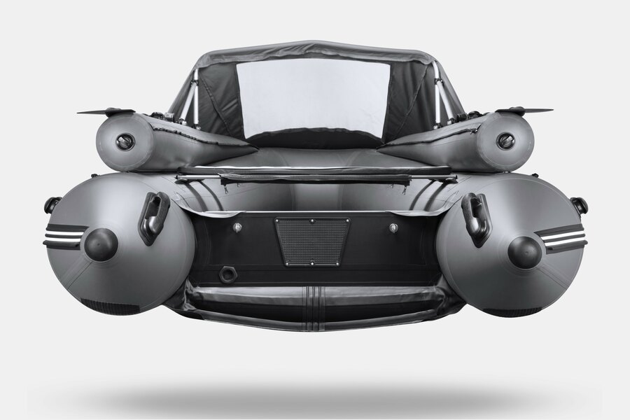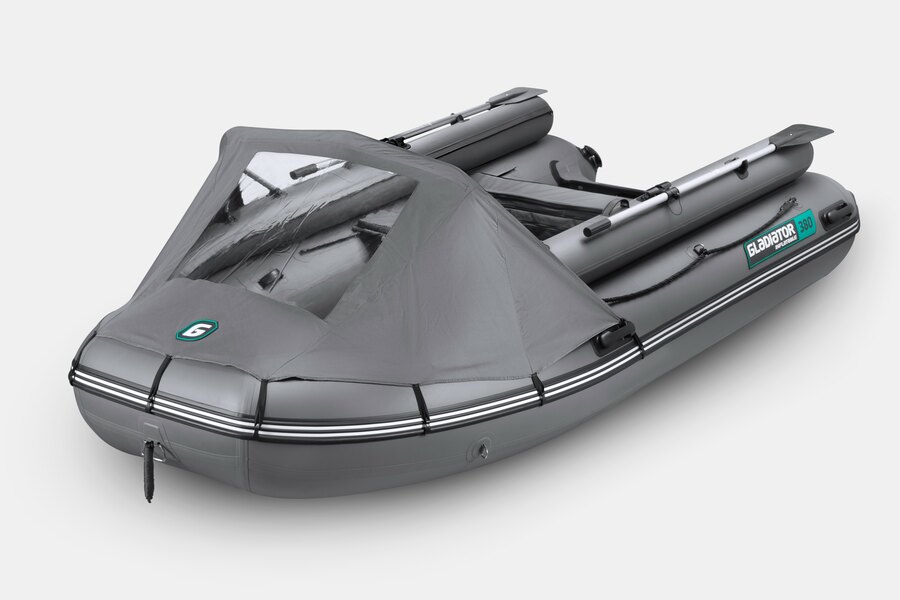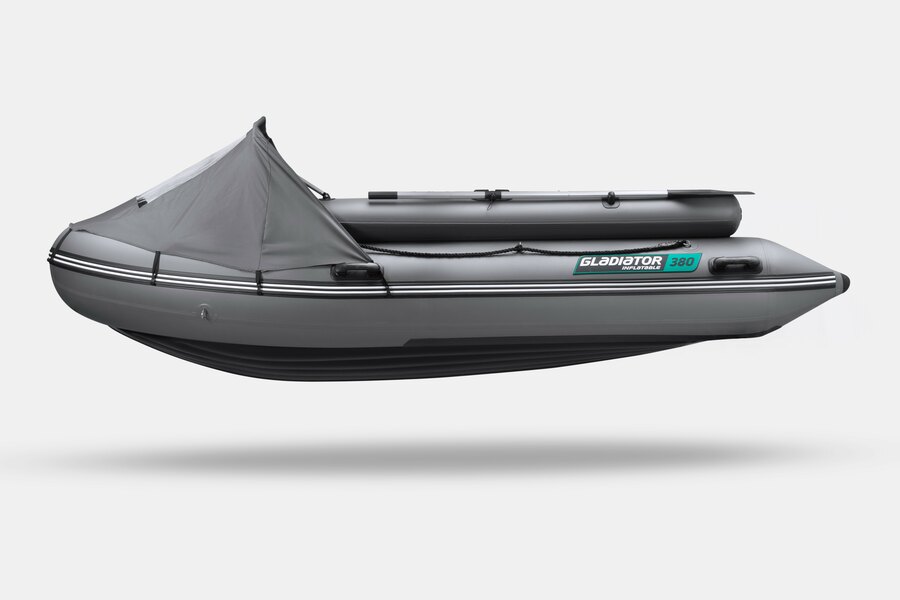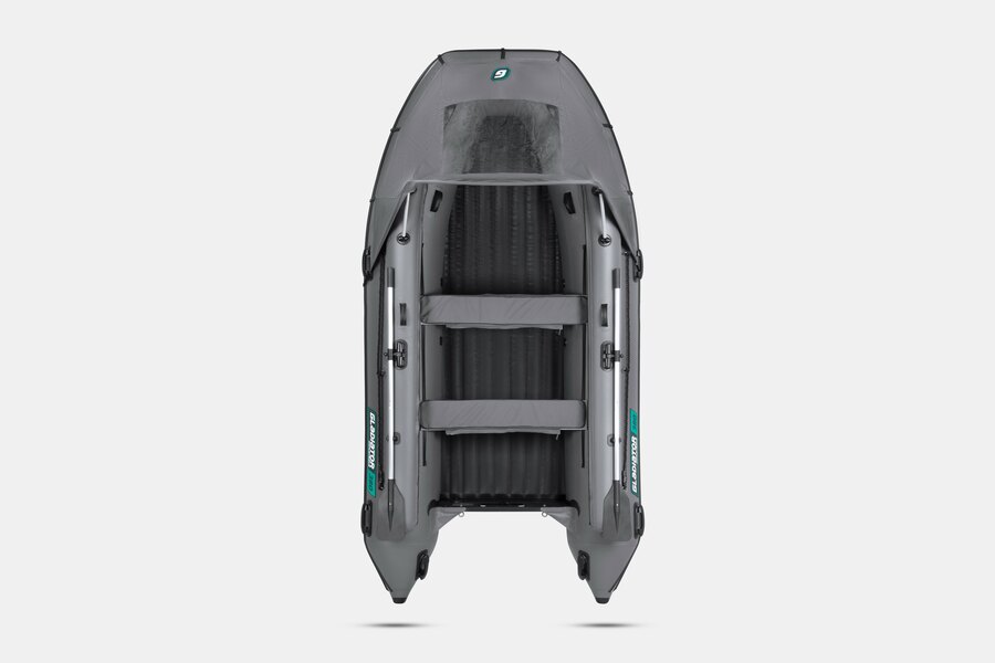 Четырехместная килевая моторная лодка GLADIATOR E380PROX темносерого цвета со стационарным транцем под мотор до 30 л.с.