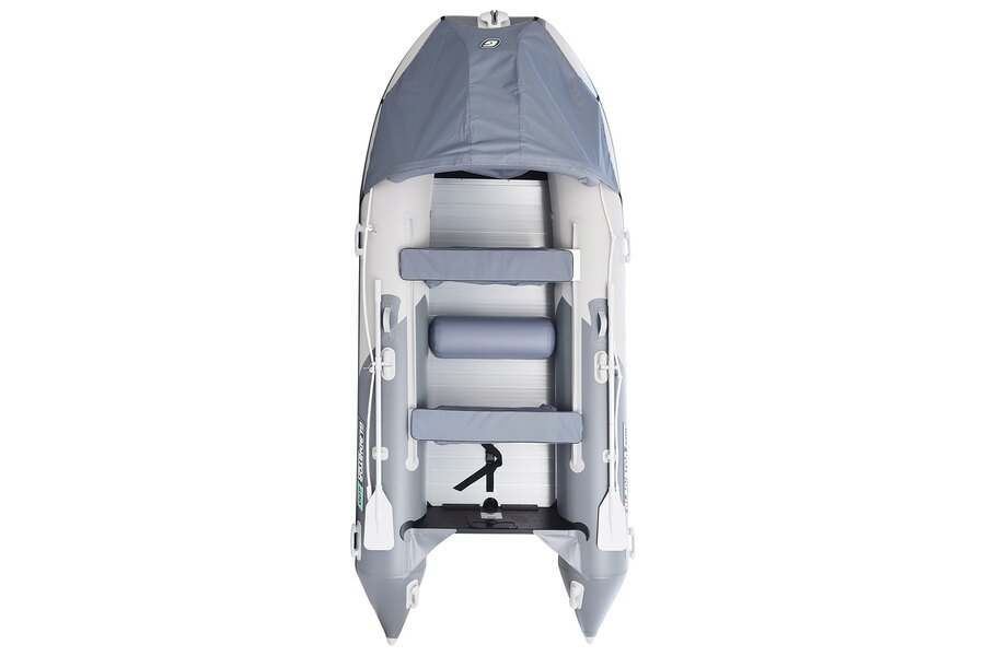 Девятиместная килевая моторная лодка GLADIATOR D470AL светло/темно-серого цвета со стационарным транцем под мотор до 50 л.с.