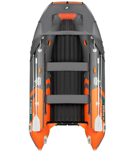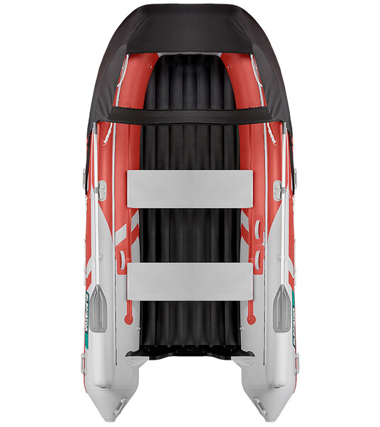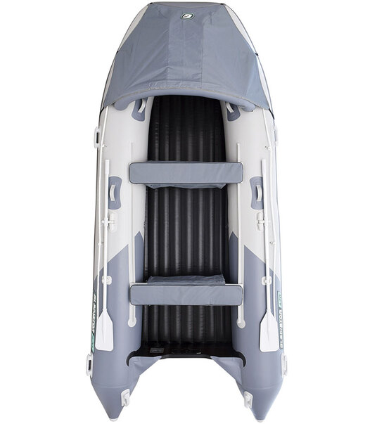 надувное дно низкого давления, плотность ПВХ баллоны 1100 г./м2, дно — 1350 г./м2, производство Китай, доп. комплектация: фальшборта, носовой тент с окном, стояночный тент, крепления на транце для буксировки, мягкие накладки на сидения с подсумками